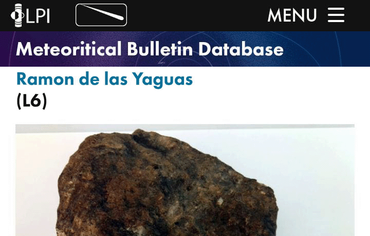 PUBLICACIÓN OFICIAL DEL METEORITO CAIDO EN RAMÓN DE LAS YAGUAS EN 2021 POR EL “METEORITICAL BULLETIN DATABASE” Acaba de ser publicado en ...