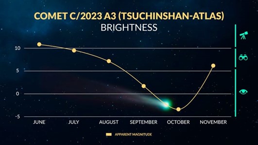 Muy pronto, descubriremos si el cometa C/2023 A3 (Tsuchinshan-ATLAS) realmente valió toda la expectación. Alrededor del 12 de octubre de 2024, podría alcanzar una magnitud de -3 y convertirse en uno de los cometas más brillantes visibles en el Hemisferio Norte en los últimos 100 años!